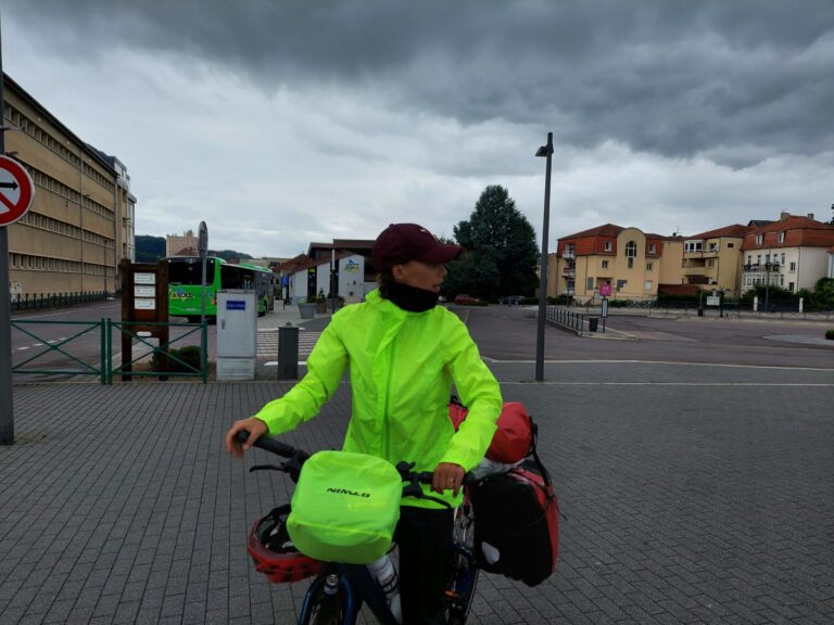 Arrivés à Saint-Avold vers 12h45, nous décidons de nous poser sur un banc pour manger les sandwichs et les œufs durs que nous avions préparé hier soir. Mais quel vent ! Il fait froid. Est-ce qu’on est bien le 1…