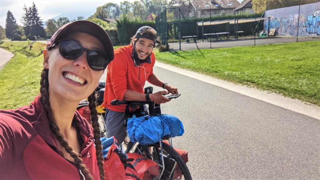 En plus sur notre route, dans les alentours de Faverges, nous allons être rejoins à vélo par Grégory. C’est une personne que j’ai connu dans ma vie professionnelle et maintenant il nous rejoint dans une étape de notre voyage. Ce n’était pas prévu, ça s’est fait le jour même, voir à même pas une heure avant notre arrivée dans les alentours. Il s’est bien dépêché pour être ici, présent avec nous. Les courses ne sont pas très bien rangées dans le frigo à cause de nous 😅 Je suis ravie, qu’il soit venu nous voir et en plus il va faire un bout de chemin avec nous. Nous allons revoir le lac d’Annecy avec lui. On réalise de plus en plus avec Massimo que c’est maintenant, ça s’approche de plus en plus notre arrivée. Vers Sévrier, Grégory il doit faire demi-tour. Un grand merci à lui, ça m’a fait vraiment plaisir de le revoir.