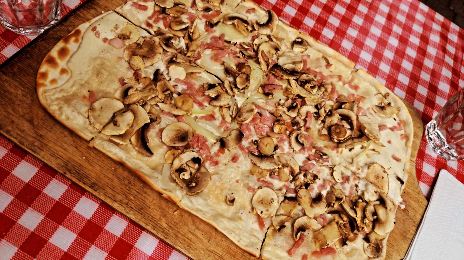 Ils nous proposent de manger ensemble à la même table. Pourquoi pas ! Nous avons donc mangé la flammekueche classique et puis aussi avec des champignons en plus et puis gratiné… Bref on a mangé des flammekueches à toutes les sauces.