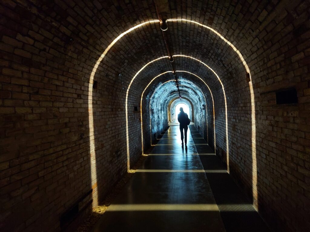 La visite se sépare en 3 étapes. La première est constituée principalement d’un parcours avec tout au long, une frise chronologique qui nous rappelle les dates et les évènements plus importants avec aussi des cartes militaires et des cartes qui montrent comment la ville de Verdun s’était organisé au front (centre de commandement, hôpitaux, hôpitaux pour animaux, poste de secours, poste de défense avec soldats, etc. La deuxième se continue avec des masques à réalité augmentée. On nous fait monter sur un traineau qui nous fera faire le tour et tout en se déplaçant entre les couloirs de la citadelle on est immergé dans la vie d’un soldat Jean Rivière, classe 1913 et à nos côtés on aura 3 autres soldats qui nous partagerons leurs ressentis au cours du passage dans la Citadelle. La dernière partie est dédiée à un parcours interactif où on peut approfondir encore plus, avec des diaporamas, des grandes télé tactiles, des jeux et des missions à faire.