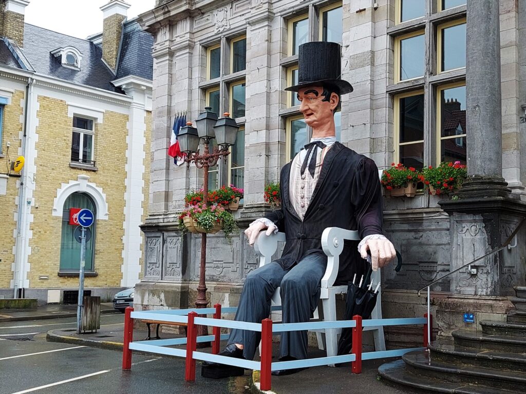 On apprend par une dame du camping qu’en fait à Bergues et dans quelques communes voisine il y a une histoire avec les géants. En 1929, deux associations de Wormhout (à 10km de Bergues) se lancèrent dans l’interprétation de pièces de théâtre comiques et eurent l’idée de fabriquer un géant. Le plus connu est le « Roi des Mitrons », réalisé en 1933, il représente un boulanger-pâtissier d’une hauteur de 4 mètres ; il est l’ambassadeur de la ville de Wormhout. Et depuis il y en a eu pleins d’autres et celui que nous avons vu devant l’Hôtel de Ville s’appelle : « L’Electeur de Lamartine ». Il faut savoir qu’à l’époque où Alphonse de Lamartine a été élu Député de Bergues, seuls les plus riches et les bourgeois pouvaient voter ; ce droit étant réservé aux contribuables versant un minimum d’impôts. En 1913, la ville de Bergues a organisé de grandes fêtes en souvenir du 80ème anniversaire de l’élection de Lamartine comme député de Bergues. A cette occasion, un nouveau géant fut construit et appelé donc « l’Electeur de Lamartine » et c’est pour cela qu’il est habillé comme un « bourgeois » de l’époque. Il est vêtu d’une redingote, coiffé d’un chapeau haut de forme et accompagné d’un grand parapluie noir (aussi appelé « un berguenard »). À chaque belle saison, le géant vient s’assoir sur la place de Bergues, près de l’Hôtel de ville et veille paisiblement sur la belle cité et se laisse photographier par les nombreux visiteurs. La dame qui nous explique tout ça est une représentante d’une association de Géant, et le sien s’appelle Gomez, il représente un hallebardier de sa majesté Philippe II, Roi d’Espagne, à l’époque de la domination espagnole en Flandre (XVIème siècle). Voilà pour la petite histoire inattendue de Bergues !