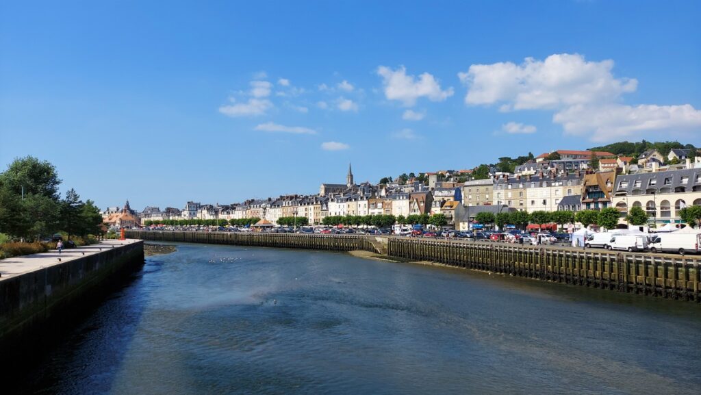 Nous reprenons à nouveau l’Eurovélo 4. Nous avançons correctement, il fait très chaud. Notre eau est déjà très chaude dans les gourdes mais il faut boire ! Nous repassons par Honfleur, nous traversons Trouville-sur-Mer, à Deauville nous rentrons dans la ville et il y a énormément de monde ; nous avons qu’une envie c’est d’en sortir vite car beaucoup de voitures sur la route, on fait Villers-sur-Mer aussi où il y a des sacrés montés et nous galérons pas mal d’ailleurs. Mais nous avons l’objectif en tête, arriver au camping pour se poser et se projeter dans notre journée de demain pour aller visiter un peu des endroits qui nous ont été conseillés hier comme Cabourg et Ouistreham. Sur notre route, Massimo voit un mirabellier, nous décidons d’en cueillir quelques-unes. Elles sont trop bonnes et en plus on les mange avec la vue sur la mer qui est au loin. C’est parfait !