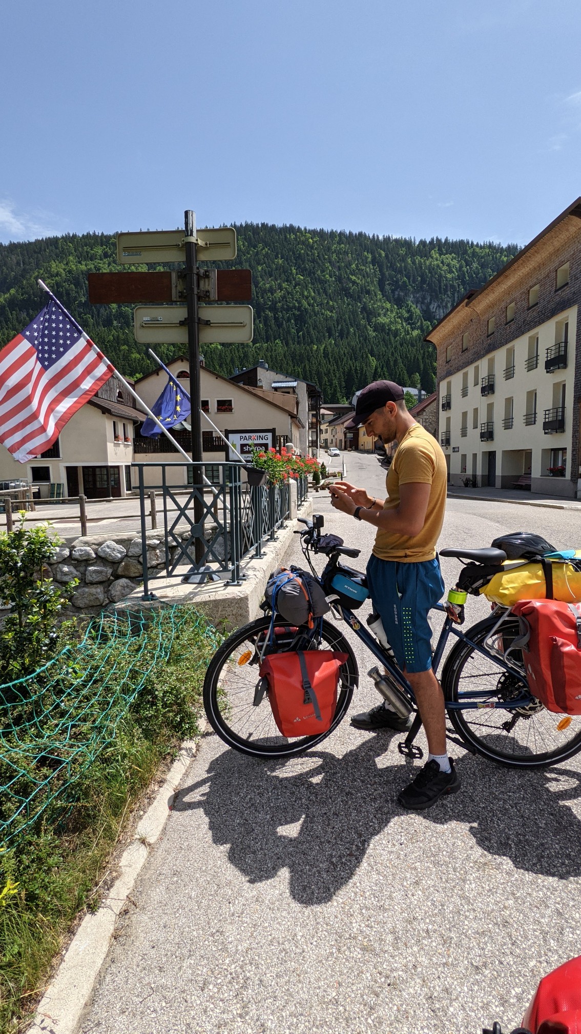 La première étape a été Lélex après à peu près 2h de pédalage. La route est peu fréquentée et assez agréable malgré la montée. Nous passons à travers plusieurs villages (qui vivent de la neige comme dit Angy), nous sommes entourés de montagnes, d’arbres, de fleurs magnifiques, de ruisseaux et de petites cascades. Tous ces paysages rappellent pleins de souvenirs de l’enfance à Angy. Le côté aussi très agréable est d’avoir de l’ombre tout au long du chemin. On se rend compte qu’il n’y a pas de comparaison entre pédaler lorsqu’il fait frais par rapport à lorsqu’on voit la chaleur au loin qui brûle l’asphalte. Raison pour laquelle on souhaite réussir à partir encore plus tôt le matin.
