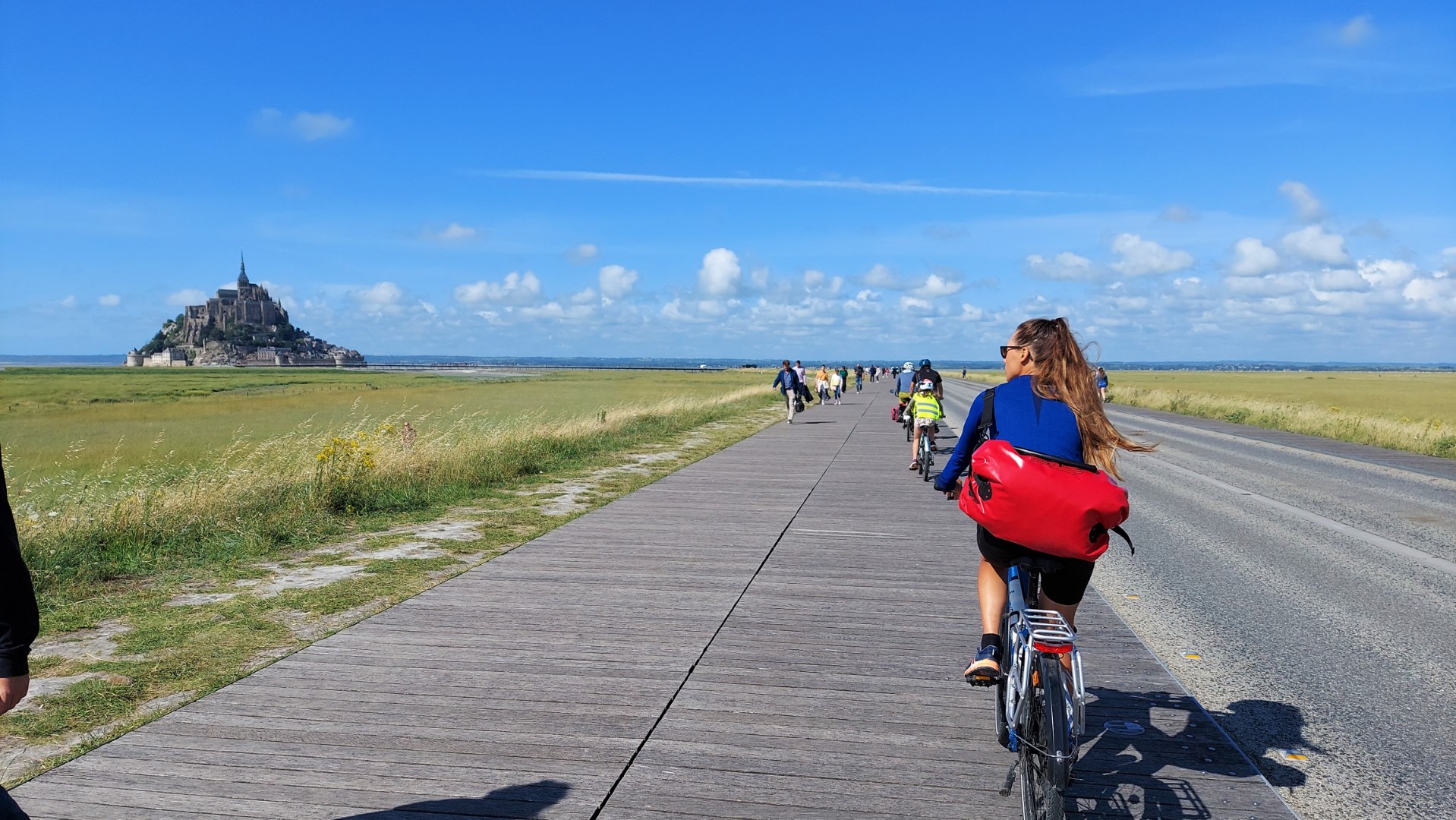 Nous aurions souhaité au départ partir tôt pour arriver tôt mais avec la pluie il faut s’adapter et revoir ses plans à chaque moment. La route va être agréable à faire. Nous reprenons l’Eurovélo 4 pour une bonne partie de notre route. Nous allons longer l’eau avec les pâturages de moutons de prés salés et les fameux Polders, terrains de sédiments marins très profonds qui offre de la précocité aux gammes de légumes. Il s’agit d’un biotope particulier qui nécessite aucune irrigation durant la période estivale, sur environ 6 000 Hectares. Ils y cultivent de la carotte, du poireau, du navet ainsi que du céleri rave. Nous allons aussi voir pleins de lapins dans les champs avec les bottes de foin. Nous voyons déjà le Mont de loin depuis un moment que nous sommes sur la route. Nous sommes pressés d’aller le voir de plus près.