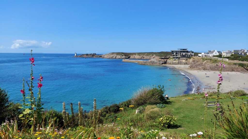 En longeant les côtes, nous passons au port de “Le Conquet“, nous pouvons voir de sublimes plages, une vue magnifique entourée de fleurs colorées. Avec cette belle vue, nous demandons à un couple de passants s’ils peuvent nous prendre en photo. Ils vont gentiment accepter. Nous allons un peu discutés. C’est Christine et Jean-Pierre de Carcassonne. On entend l’accent qui chante ! On adoooore. Ils vont aussi nous proposer d’échanger nos numéros de téléphone comme ça, si on est de passage à Carcassonne pendant notre tour, on se fera un coucou. Ça serait trop cool de se revoir !